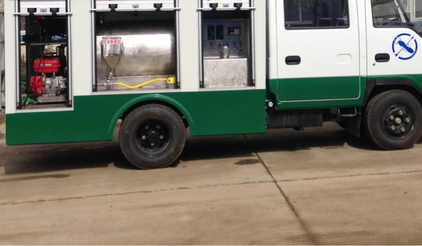 衛(wèi)生防疫車是一種可通過電腦來控制藥物的兌比濃度、并可自動(dòng)灌裝,攪拌的新型白蟻防治車。其特點(diǎn)是此白蟻防治車上有配藥系統(tǒng),噴藥系統(tǒng),攪拌系統(tǒng)及清洗系統(tǒng)。此車上配有兩個(gè)罐體,采用上下疊加式連接,上部罐體為清水箱,下部罐體為配藥箱。在罐體前部另外配有單獨(dú)的藥箱(液體藥物),藥箱上部安裝電腦控制系統(tǒng),后部安裝加藥機(jī),另在整車后部安裝有高壓泵及卷盤。配藥時(shí)只需按所需的比例在電腦上輸入所需要的加水量及加藥量即可自動(dòng)配藥。當(dāng)藥物通過加藥機(jī)輸入到配藥箱后,即可啟動(dòng)車輛的攪拌系統(tǒng)。另外此車輛還單獨(dú)配有粉狀藥物灌裝到配藥箱的功能,只需將粉狀藥物倒入其單獨(dú)設(shè)置的投料口即可操作配藥。