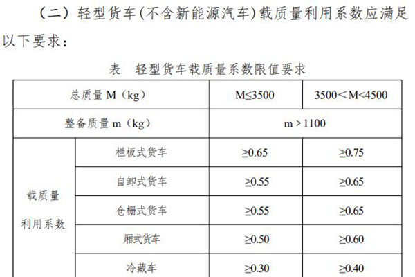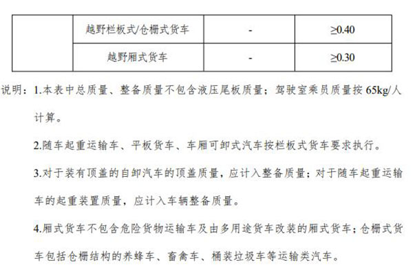 對載質(zhì)量系數(shù)的要求中包含很多專用車型,其中隨車起重運輸車、平板貨車、車廂可卸式汽車按欄板式貨車要求執(zhí)行;對于裝有頂蓋的自卸汽車的頂蓋質(zhì)量,應計入整備質(zhì)量,對于隨車起重運輸車的起重裝置質(zhì)量,應計入車輛整備質(zhì)量;廂式貨車不包含貨物運輸車及由多用途貨車改裝的廂式貨車,倉柵式貨車包括倉柵結(jié)構(gòu)的養(yǎng)蜂車、畜禽車、桶裝垃圾車等運輸類汽車。
