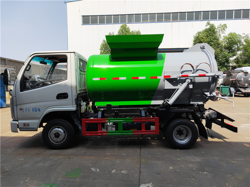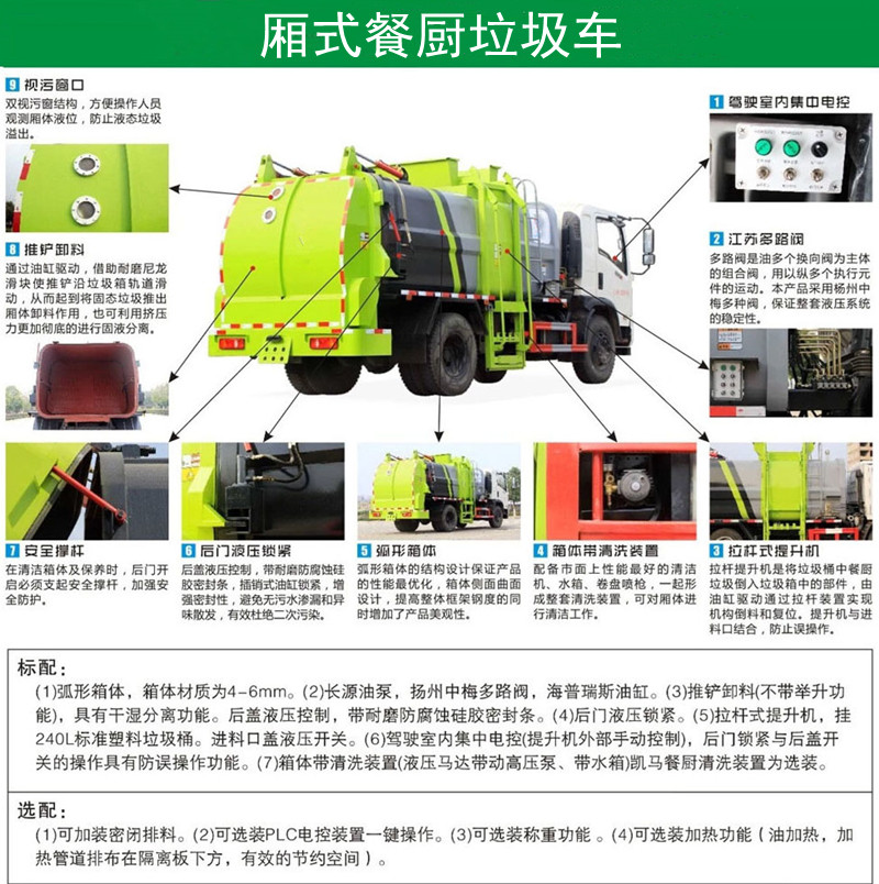 方罐式餐廚垃圾車:弧形廂體,箱體內(nèi)可實現(xiàn)固液分離,推鏟卸料,后蓋液壓開啟/鎖緊(帶耐磨橡膠密封條密封-后門關(guān)閉后滴水不漏),后門液壓鎖緊防誤操作功能,掛桶式提升機,可配合120升、240升標準垃圾桶使用,清洗裝置(帶水箱、液壓馬達帶動高壓泵)。