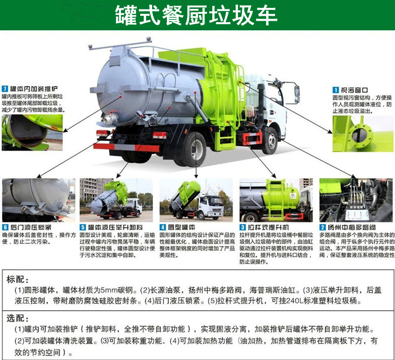 功能配置:箱體液壓舉升卸料,后蓋液壓打開和鎖緊(帶耐磨防腐蝕硅膠密封條密封-后門關(guān)閉后滴水不漏),后蓋液壓雙重鎖緊裝置,掛桶式提升機(jī),可配合120升、240升標(biāo)準(zhǔn)垃圾桶使用。