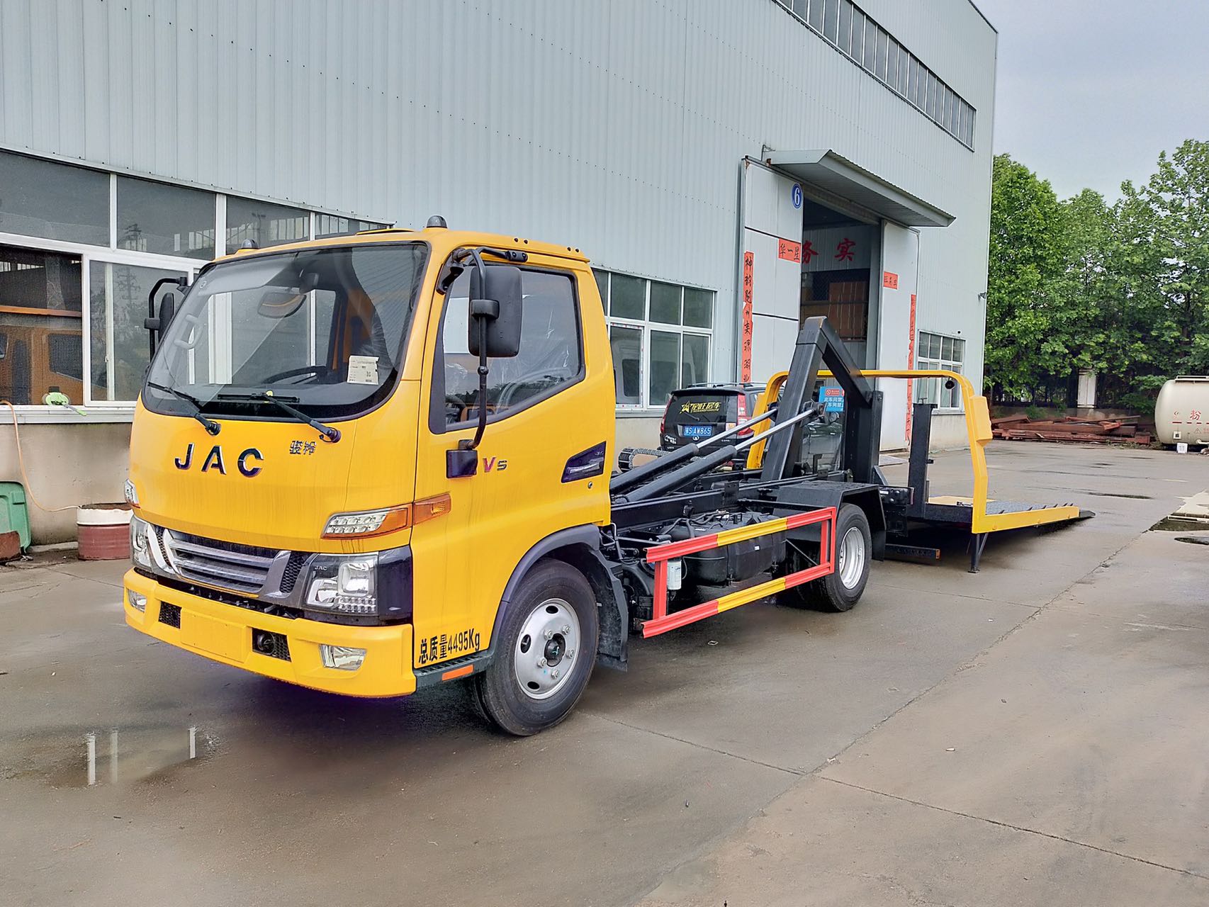 上裝配置:采用沖孔沖壓板或花紋板制成,雙側(cè)聯(lián)動(dòng)操作裝置,4噸液壓絞盤(25米鋼絲繩),**小車一對(duì),七字抱胎裝置一套,捆綁帶4條,輪胎擋板一對(duì),工具箱一個(gè),后工作燈兩只。