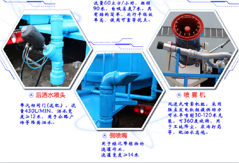 上裝配置:罐體采用國標Q235碳鋼板材制作,產(chǎn)品質(zhì)量成熟可靠,設(shè)計**合理,比同類灑水泵吸程遠、壓力大、使用壽命長,可泵進泵出。前沖、后灑、側(cè)噴、高位花灑、帶后工作平臺及綠化灑水高炮(可全方位旋轉(zhuǎn),可連續(xù)調(diào)成直沖狀、大雨、小雨、毛毛雨等),抑塵霧炮(可降塵、噴霧、消毒、打農(nóng)藥等),水位計,消防栓接口、快速接口、兩根輸水管,其余標配。